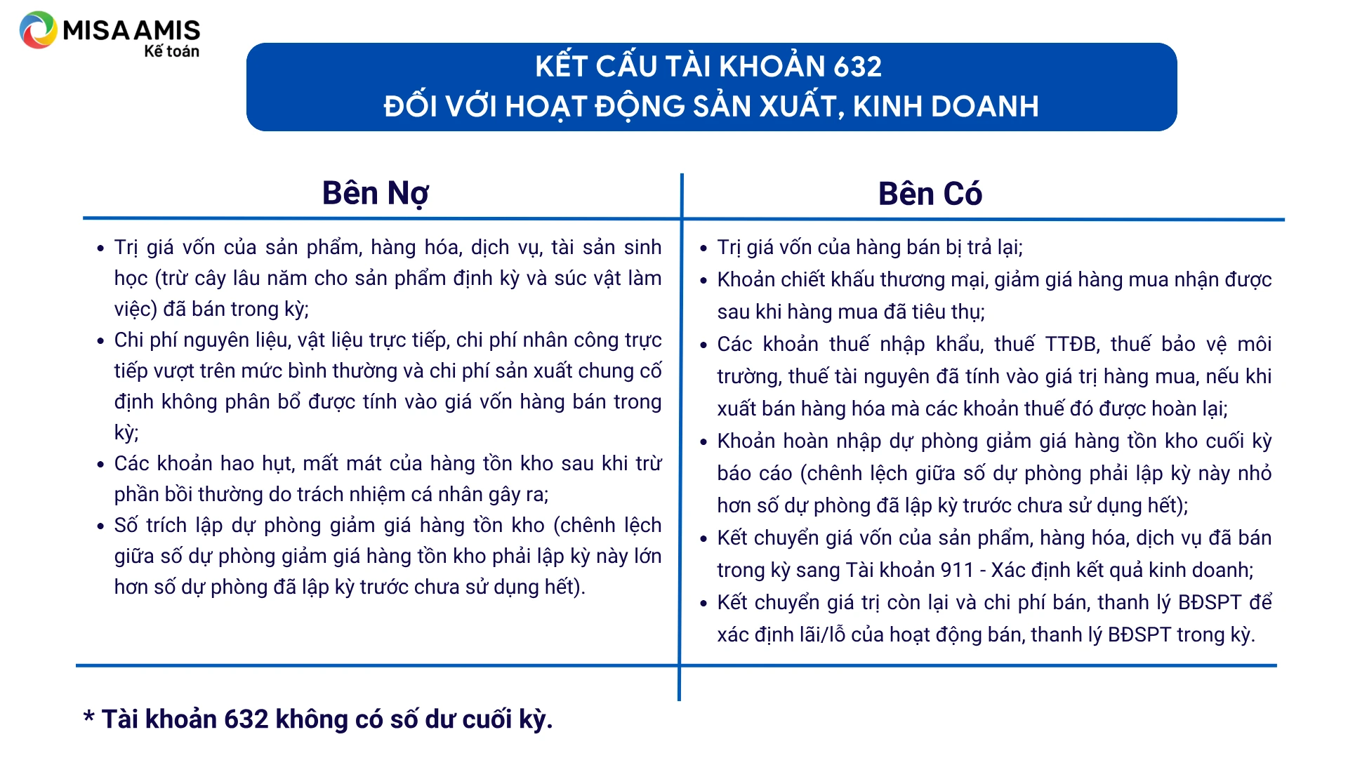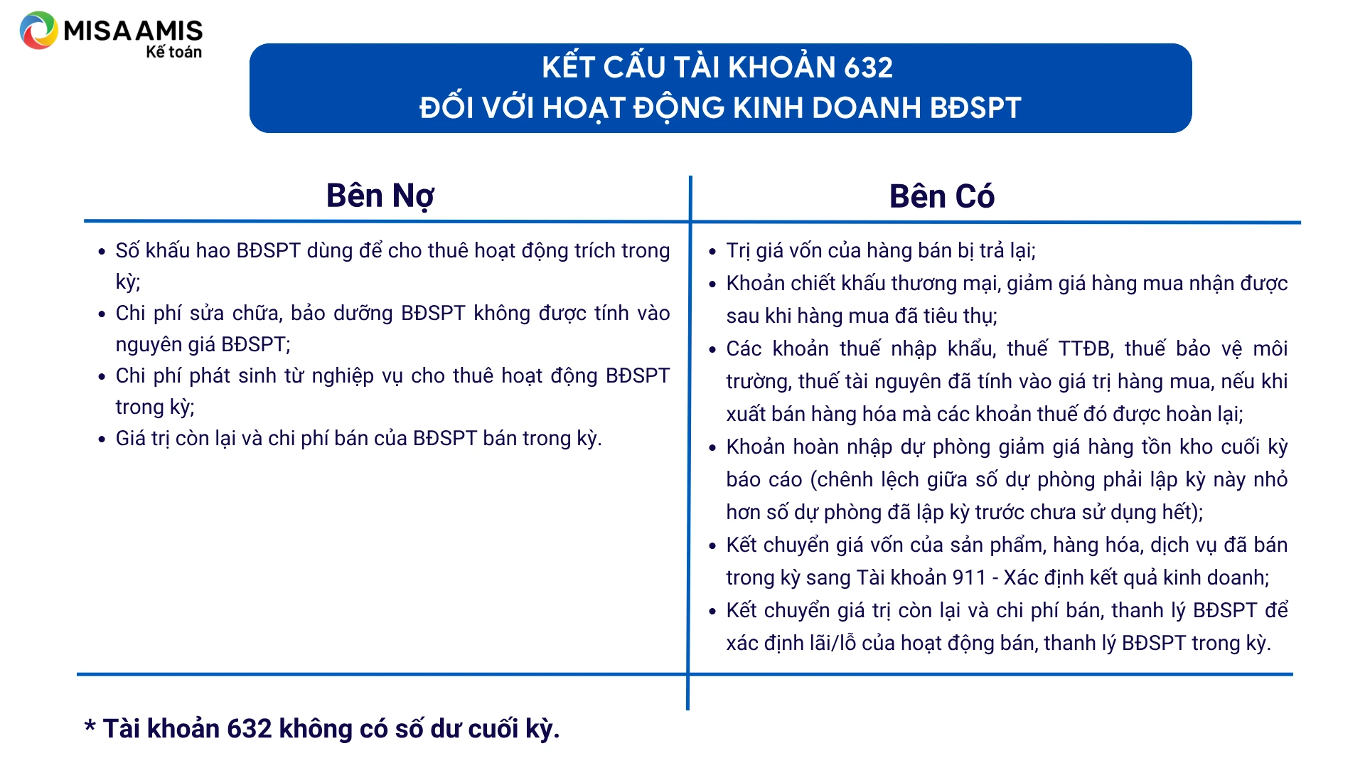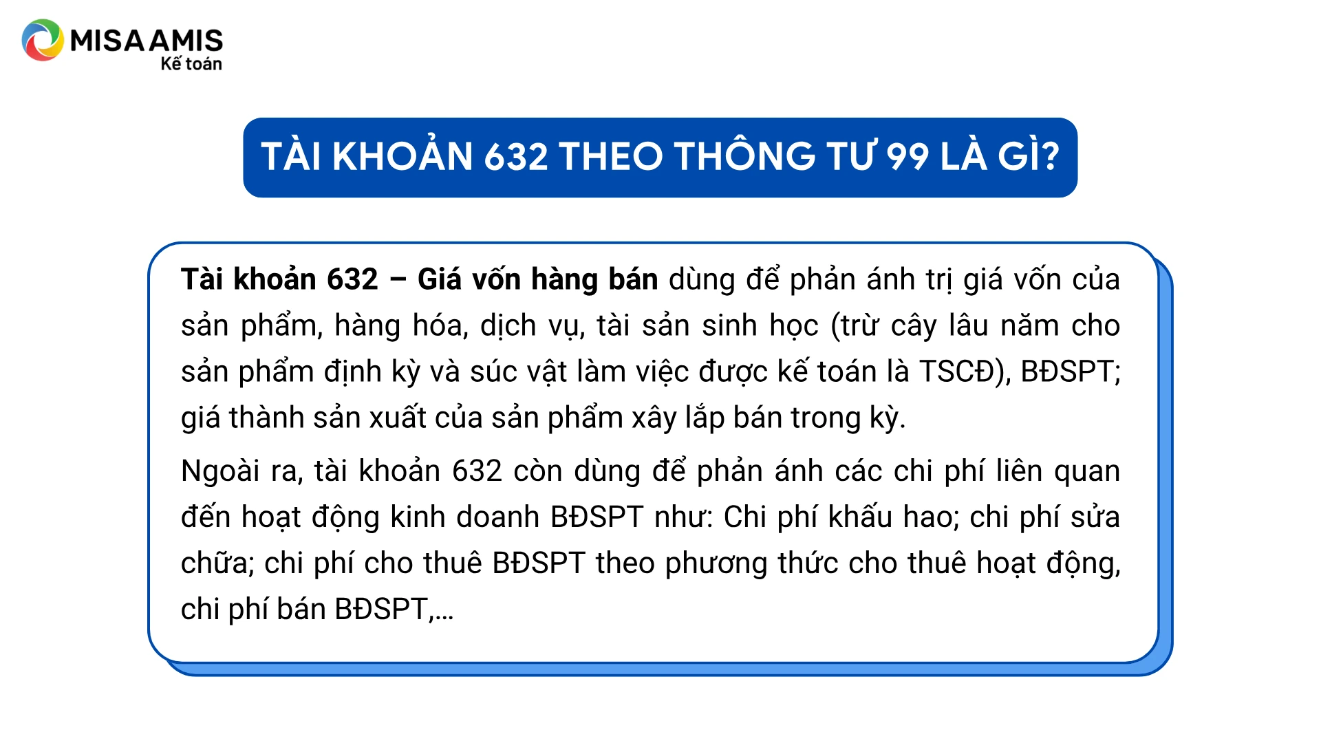 - Tài khoản 632 được sử dụng để phản ánh trị giá vốn của hàng hóa, sản phẩm, dịch vụ, tài sản sinh học (ngoại trừ cây lâu năm cho sản phẩm định kỳ và súc vật làm việc được ghi nhận là tài sản cố định), BĐSPT, cũng như giá thành sản xuất của công trình, sản phẩm xây lắp đã bàn giao trong kỳ. Đồng thời, TK này cũng dùng để phản ánh các chi phí liên quan đến hoạt động kinh doanh bất động sản để bán, bao gồm chi phí khấu hao, sửa chữa, chi phí bán hàng, chi phí cho thuê bất động sản theo hình thức cho thuê hoạt động,…