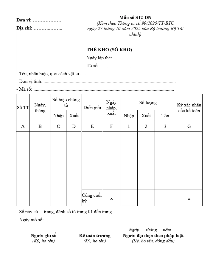 Mẫu thẻ kho (sổ kho) cho doanh nghiệp từ 2026 được quy định tại Phụ lục 3 ban hành kèm theo Thông tư 99/2025/TT-BTC là Mẫu số S12-DN.