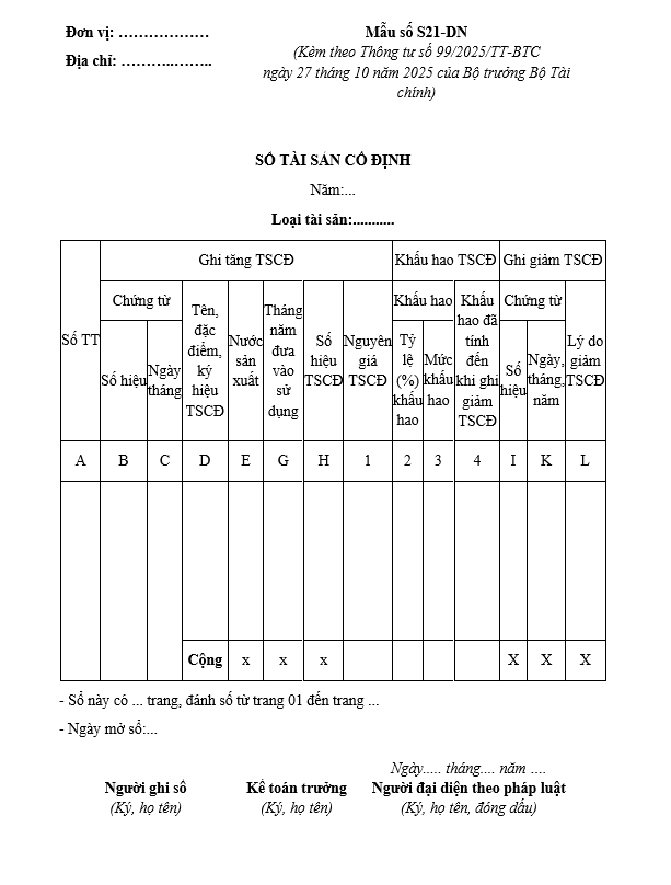 Mẫu Sổ tài sản cố định theo Thông tư 99/2025 (Mẫu số S21-DN) là sổ kế toán dùng để đăng ký, theo dõi và quản lý tài sản cố định trong doanh nghiệp.