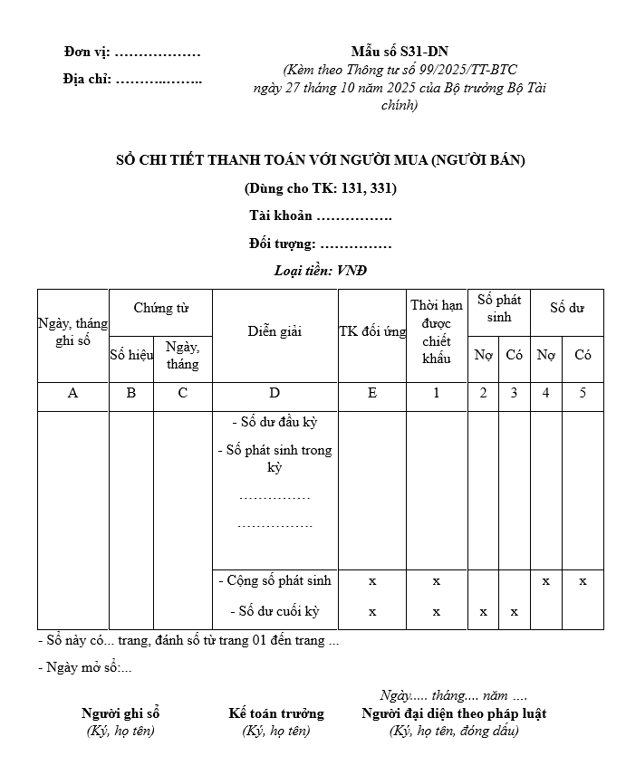 Mẫu sổ chi tiết thanh toán với người mua (người bán) là mẫu số S31-DN ban hành kèm theo Thông tư 99/2025/TT-BTC.