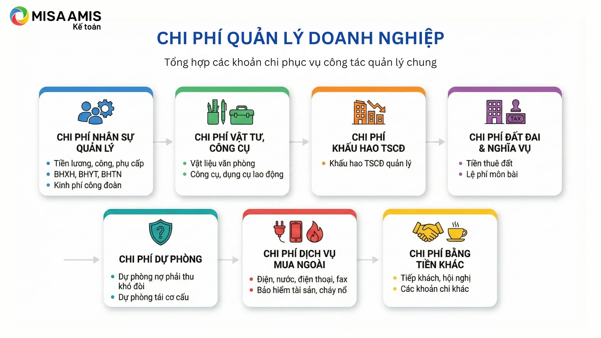 - Chi phí nhân sự quản lý doanh nghiệp: tiền lương, tiền công, các khoản phụ cấp phải trả cho nhân viên bộ phận quản lý; các khoản trích theo lương như bảo hiểm xã hội, bảo hiểm y tế, bảo hiểm thất nghiệp, kinh phí công đoàn.