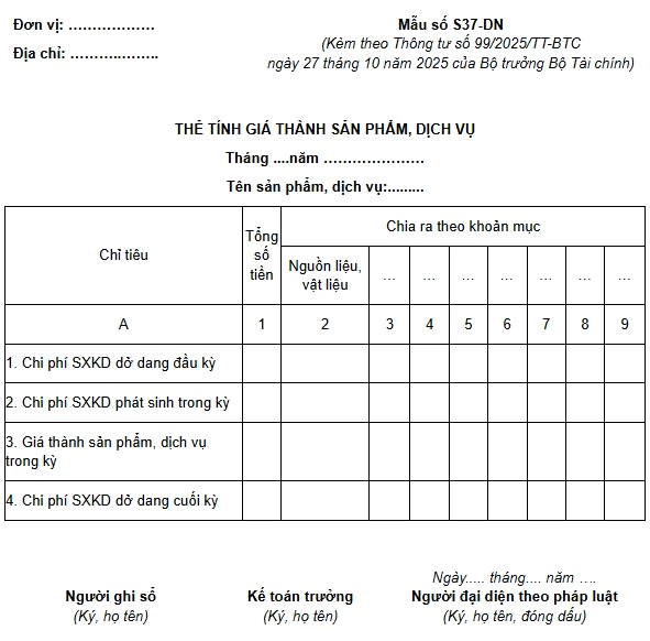 Mẫu Thẻ tính giá thành sản phẩm, dịch vụ được quy định tại Mẫu số S37-DN Phụ lục 3 ban hành kèm theo Thông tư 99/2025/TT-BTC áp dụng từ ngày 01/01/2026.