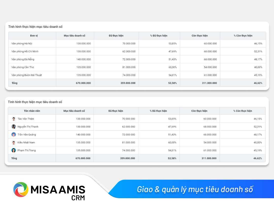 - Quản lý doanh số và KPI: Giao chỉ tiêu bán hàng cho từng sales, phòng ban và theo dõi thực hiện mục tiêu theo ngày/tháng/quý/năm.