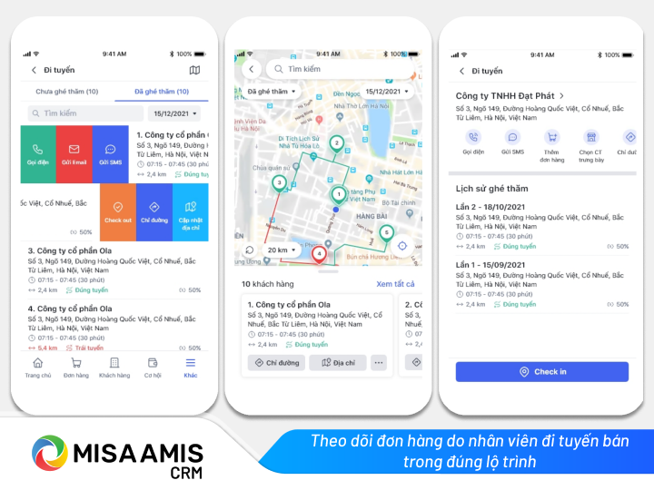 - Giám sát sales đi tuyến: Lập kế hoạch và theo dõi lộ trình, check-in/check-out của nhân viên bán hàng ngoài thị trường để đánh giá hiệu quả hoạt động.