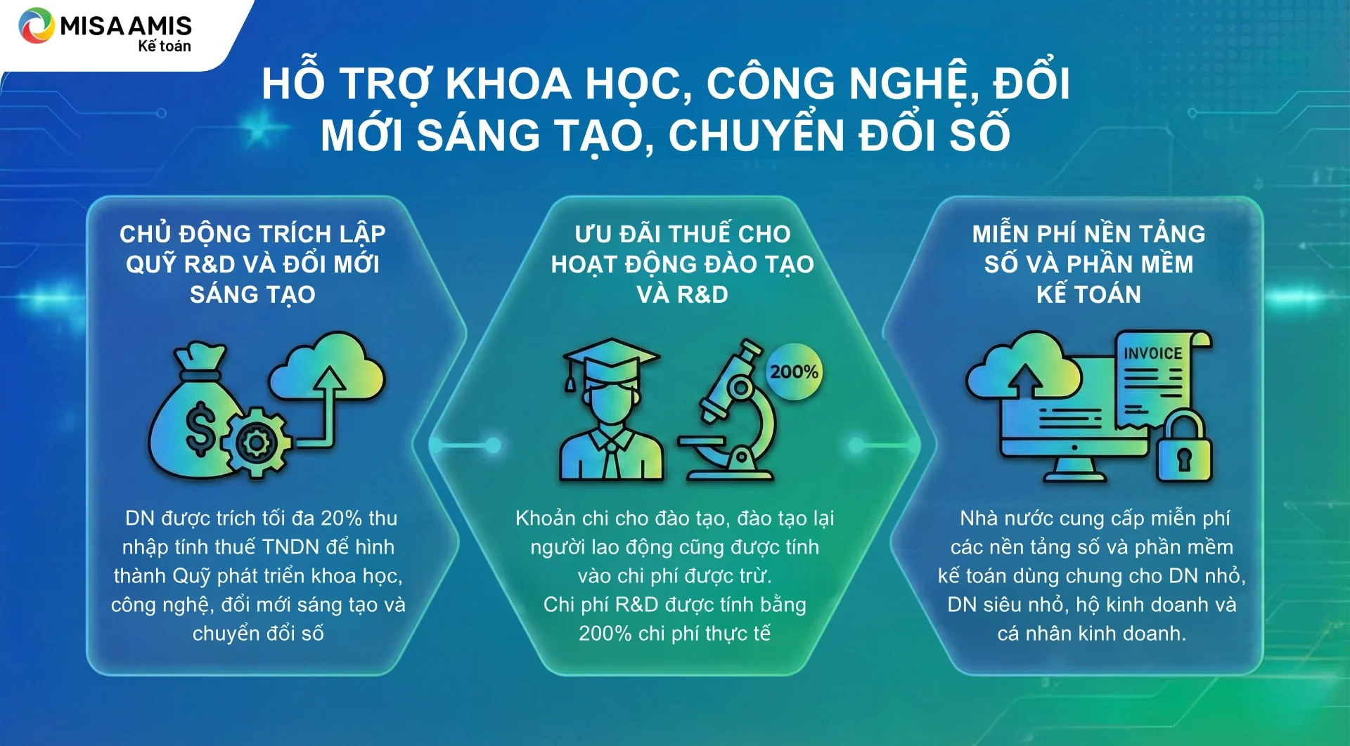 Nhằm thúc đẩy doanh nghiệp tăng cường nghiên cứu – phát triển (R&D), đổi mới sáng tạo và chuyển đổi số, Nhà nước cho phép doanh nghiệp được trích tối đa 20% thu nhập tính thuế thu nhập doanh nghiệp để hình thành Quỹ phát triển khoa học, công nghệ, đổi mới sáng tạo và chuyển đổi số.