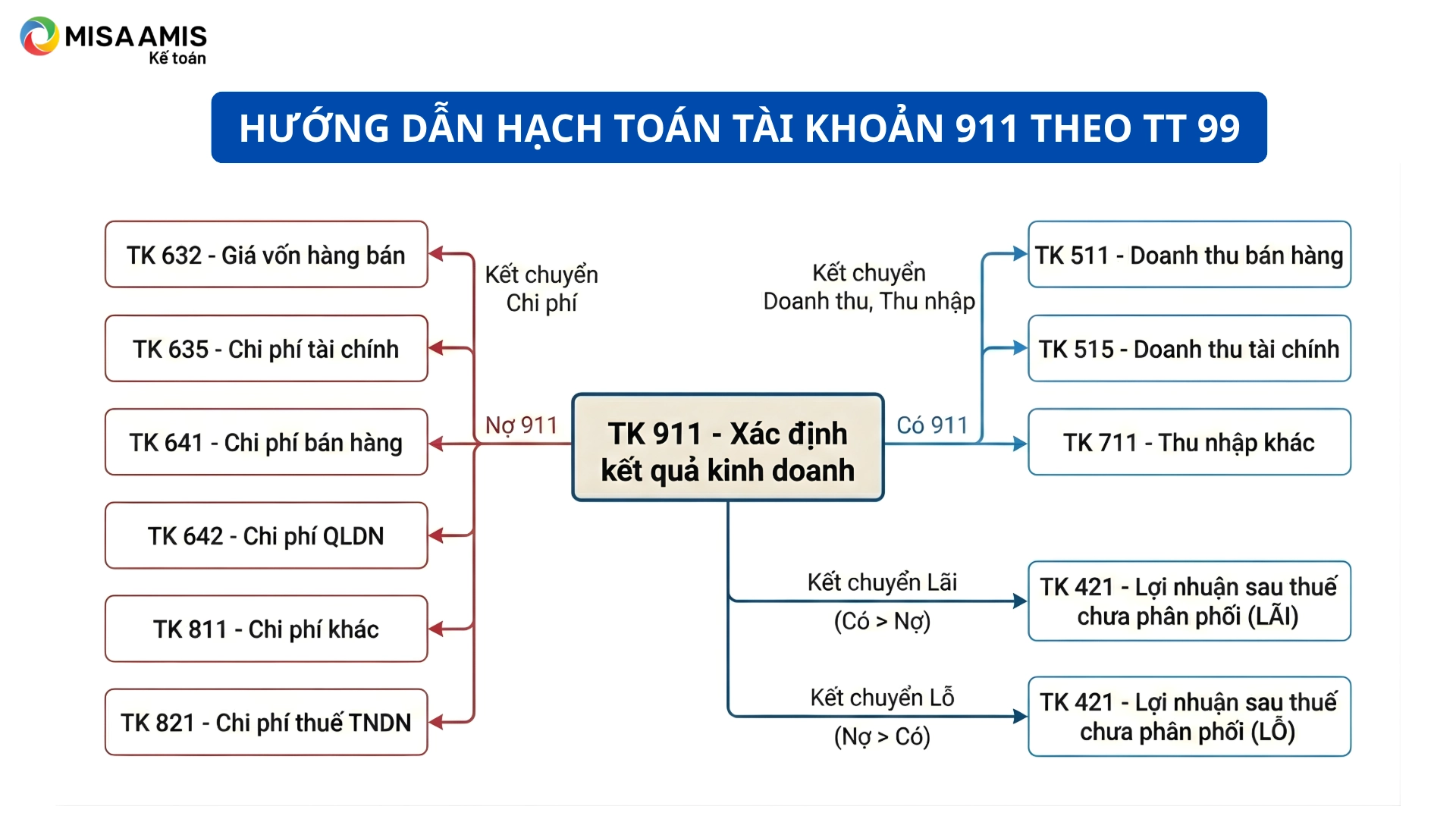 Tài khoản 911 là tài khoản dùng để xác định và phản ánh kết quả hoạt động của doanh nghiệp trong một kỳ kế toán nhất định. Tài khoản này không có số dư cuối kỳ.