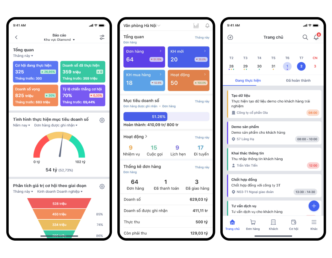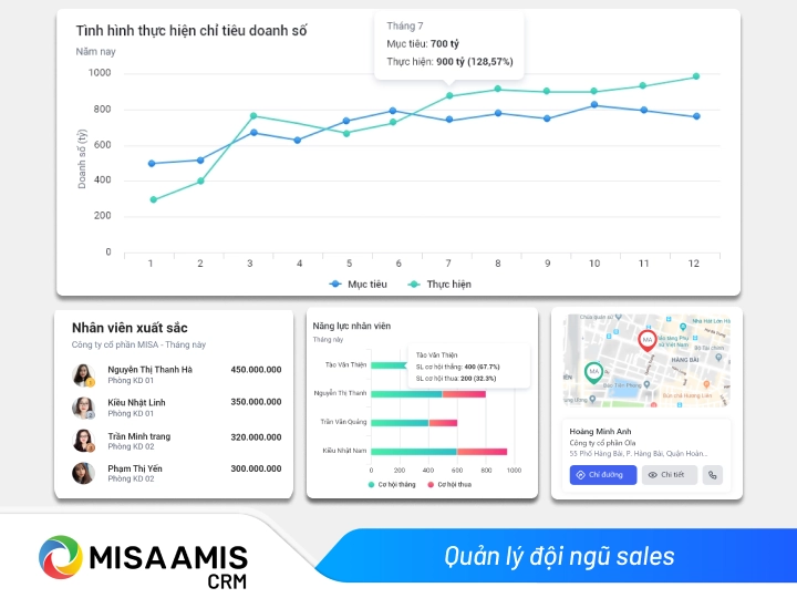 - Quản lý đội ngũ bán hàng hiệu quả: Phần mềm CRM giúp phân bổ KPI, theo dõi năng suất, quản lý đội sales đi thị trường. Quản lý có thể giám sát quá trình hoàn thành doanh số, đánh giá năng lực nhân viên kịp thời và chính xác theo từng ngày