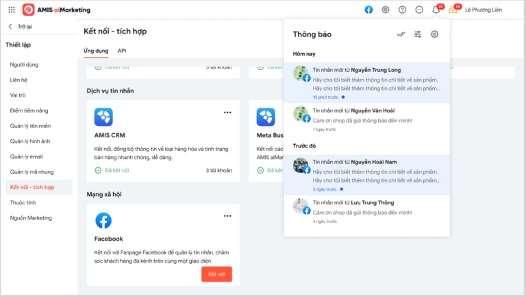 - Liên kết với mạng xã hội và các kênh tương tác khác: Phần mềm CRM liên kết với Fanpage, Zalo OA để thu thập và quản lý thông tin khách hàng từ đa kênh. Nhờ đó tăng tốc độ chăm sóc, giảm thời gian chờ, xót cơ hội.