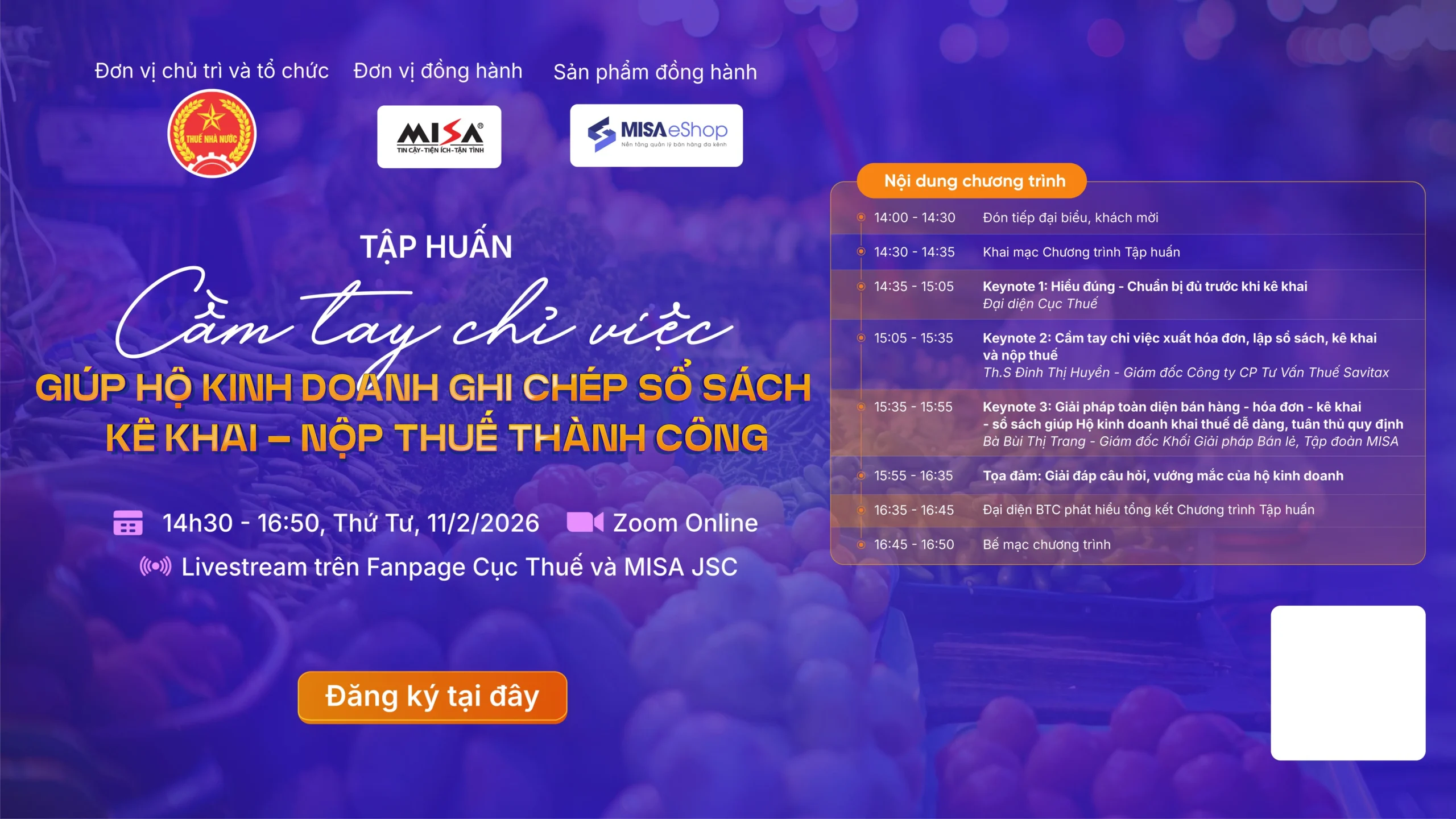 Nhằm kịp thời hỗ trợ hộ kinh doanh thực hiện đúng quy định pháp luật về thuế, Cục Thuế chủ trì tổ chức Chương trình tập huấn trực tuyến với sự đồng hành của Tập đoàn MISA với chủ đề “CẦM TAY CHỈ VIỆC – HƯỚNG DẪN HỘ KINH DOANH GHI CHÉP SỔ SÁCH, KÊ KHAI VÀ NỘP THUẾ THÀNH CÔNG”. Chương trình tập huấn tập trung hướng dẫn thực hành theo hình thức “cầm tay chỉ việc” các nội dung: ghi chép sổ sách, quản lý hàng hóa, lập hóa đơn điện tử, kê khai và nộp thuế đúng quy định, giúp hộ kinh doanh chủ động kiểm soát số liệu ngay trong mùa cao điểm kinh doanh.