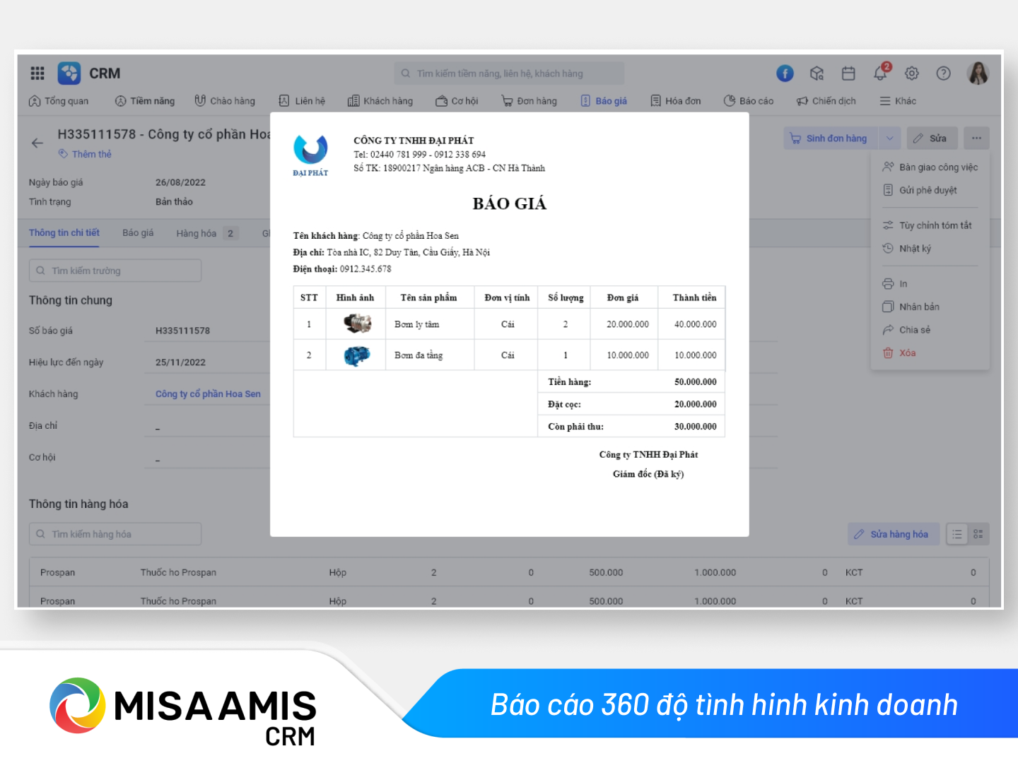 - Hệ thống báo cáo từ tổng quan đến chi tiết trực quan: Bảng biểu, hình ảnh, sơ đồ báo cáo đầy đủ giúp CEO nhanh chóng nắm bắt dữ liệu về doanh thu tổng quan, hiệu suất từng sales, doanh số từng sản phẩm. Từ đó nhanh chóng ra quyết định.