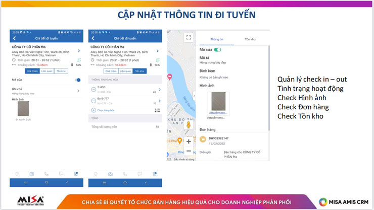 - Phần mềm CRM liên thông trực tiếp với AMIS Kế toán lấy các số liệu về công nợ, AMIS kho để kiểm tồn, vị trí hàng hóa; AMIS mua hàng để đặt lệnh mua thêm, AMIS Sản xuất để yêu cầu đơn hàng cho xưởng; AMIS nhân sự để chấm công cho sales thị trường đi tuyến.