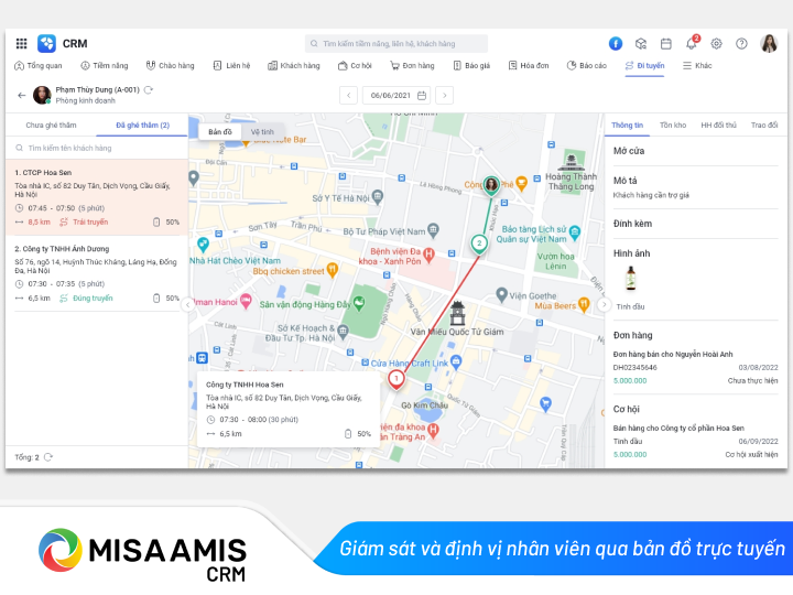 Ngược lại nếu DN sử dụng phần mềm quản lý sales thị trường như AMIS CRM, quản lý có thể theo dõi dễ dàng lộ trình đi tuyến, lịch sử, thời gian ghé thăm điểm bán, doanh thu, tình hình CSKH… Nhân viên kinh doanh có thể tự cập nhật trên app điện thoại, tra cứu tồn kho, báo giá, lên đơn ngay khi đi tuyến.