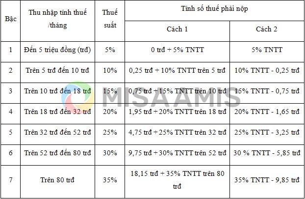 - Thuế suất: Áp dụng theo biểu thuế lũy tiến từng phần, gồm 7 bậc với 5 mức thuế suất từ 5 – 35%.