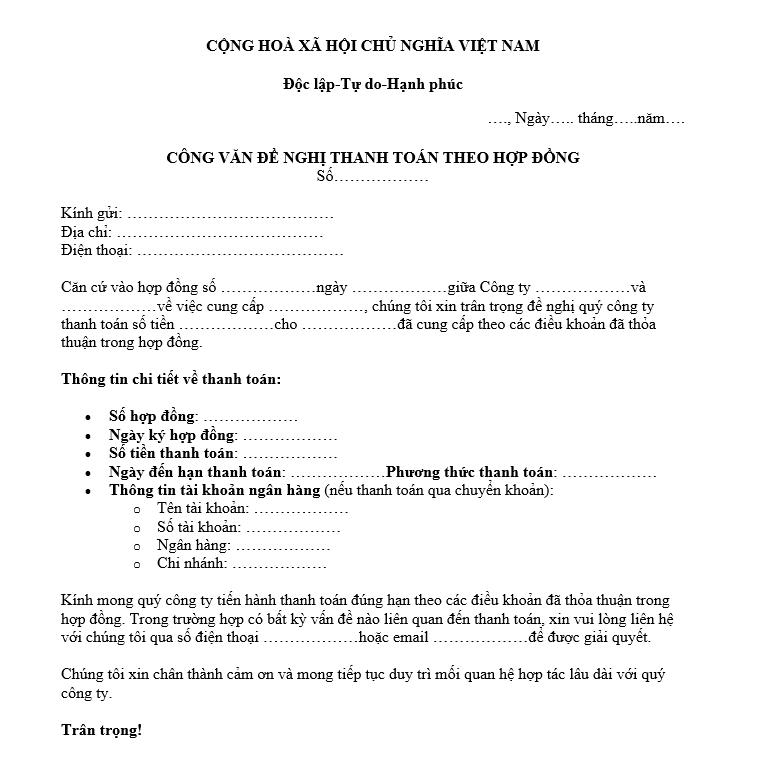 Mẫu công văn đề nghị thanh toán theo hợp đồng