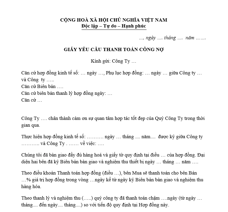 Mẫu đề nghị thanh toán công nợ là một trong những công cụ không thể thiếu trong việc thu hồi nợ. Các mẫu công văn và giấy đề nghị thanh toán công nợ giúp doanh nghiệp nhắc nhở khách hàng về nghĩa vụ thanh toán, đồng thời thúc đẩy quá trình thanh toán đúng hạn, giảm thiểu nợ quá hạn.