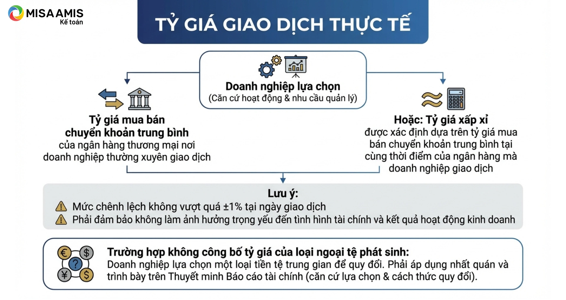 - Trường hợp ngân hàng thương mại nơi doanh nghiệp thường xuyên có giao dịch không công bố tỷ giá của loại ngoại tệ mà doanh nghiệp phát sinh thì doanh nghiệp được lựa chọn một loại tiền tệ trung gian để quy đổi sang đơn vị tiền tệ trong kế toán của đơn vị nhưng phải áp dụng nhất quán theo quy định của chuẩn mực kế toán Việt Nam. Doanh nghiệp phải trình bày trên Thuyết minh Báo cáo tài chính về căn cứ lựa chọn loại tiền tệ trung gian đó và cách thức quy đổi loại ngoại tệ phát sinh giao dịch sang đơn vị tiền tệ trong kế toán của doanh nghiệp.