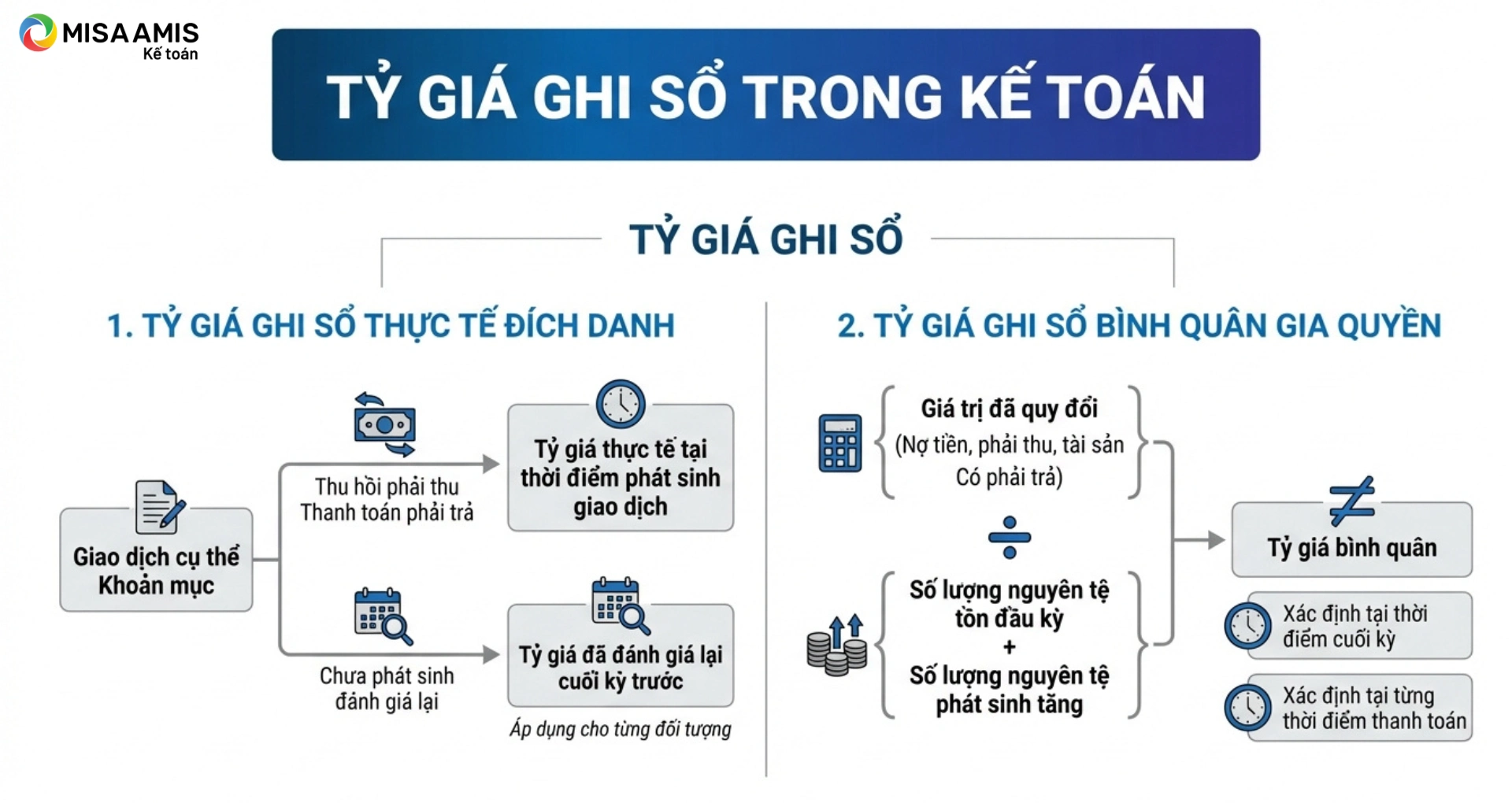 Tỷ giá ghi sổ bao gồm tỷ giá ghi sổ thực tế đích danh hoặc tỷ giá ghi sổ bình quân gia quyền. Việc áp dụng tỷ giá ghi sổ thực tế đích danh hay tỷ giá ghi sổ bình quân gia quyền tùy theo đặc điểm và yêu cầu quản lý các khoản mục tiền tệ có gốc ngoại tệ của doanh nghiệp.