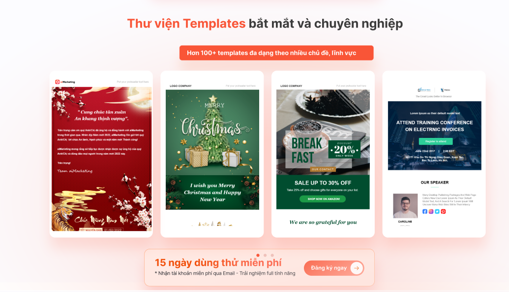 Bên cạnh đó, để giúp người dùng thiết kế email nhanh chóng, aiMarketing có kho mẫu email với hơn 100+ template đa dạng cho nhiều ngành nghề/lĩnh vực/sản phẩm/mục đích.