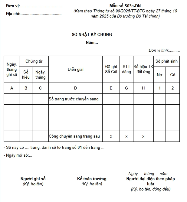 2.1. Mẫu sổ nhật ký chung theo Thông tư số 99/2025/TT-BTC