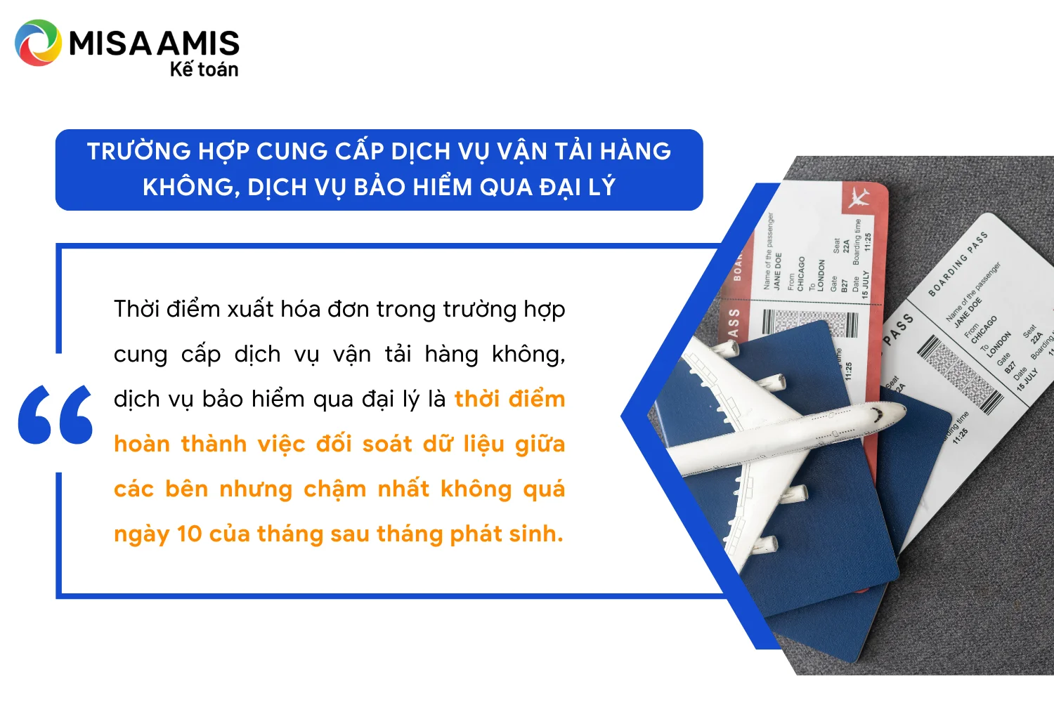 Thời điểm xuất hóa đơn trong trường hợp cung cấp dịch vụ vận tải hàng không, dịch vụ bảo hiểm qua đại lý là thời điểm hoàn thành việc đối soát dữ liệu giữa các bên nhưng chậm nhất không quá ngày 10 của tháng sau tháng phát sinh.