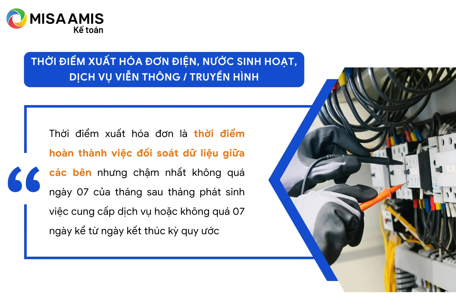 | Thời điểm xuất hóa đơn dịch vụ viễn thông, dịch vụ công nghệ thông tin | Khoản 4 Điều 9 Nghị định 123/2020/NĐ-CP | Là thời điểm hoàn thành việc đối soát dữ liệu về cước dịch vụ theo hợp đồng kinh tế giữa các cơ sở kinh doanh dịch vụ nhưng chậm nhất không quá 2 tháng kể từ tháng phát sinh cước dịch vụ kết nối |