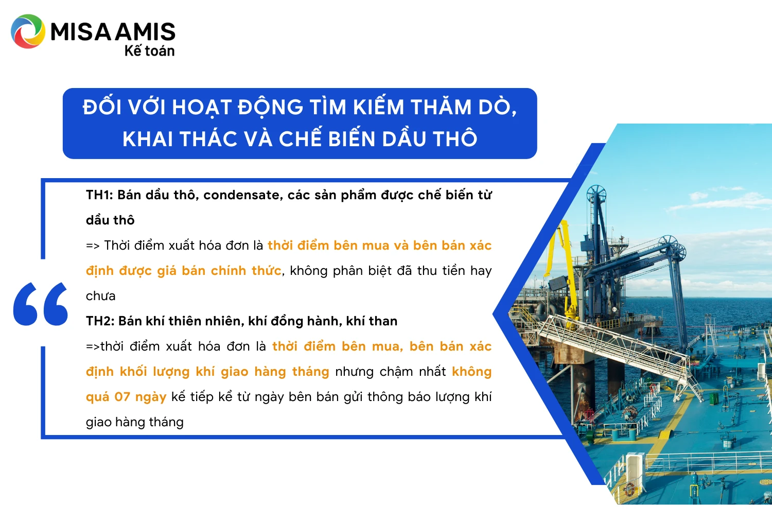 Thời điểm xuất hóa đơn với hoạt động tìm kiếm, thăm dò, khai thác và chế biến dầu thô được quy định như sau: