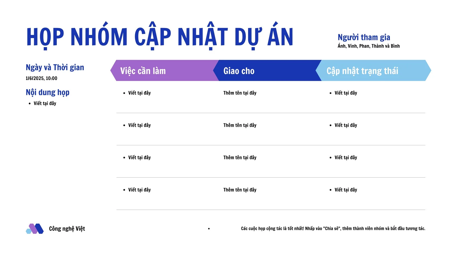 - Tránh dồn quá nhiều nội dung – mỗi cuộc họp chỉ nên tập trung vào 2–4 vấn đề chính.