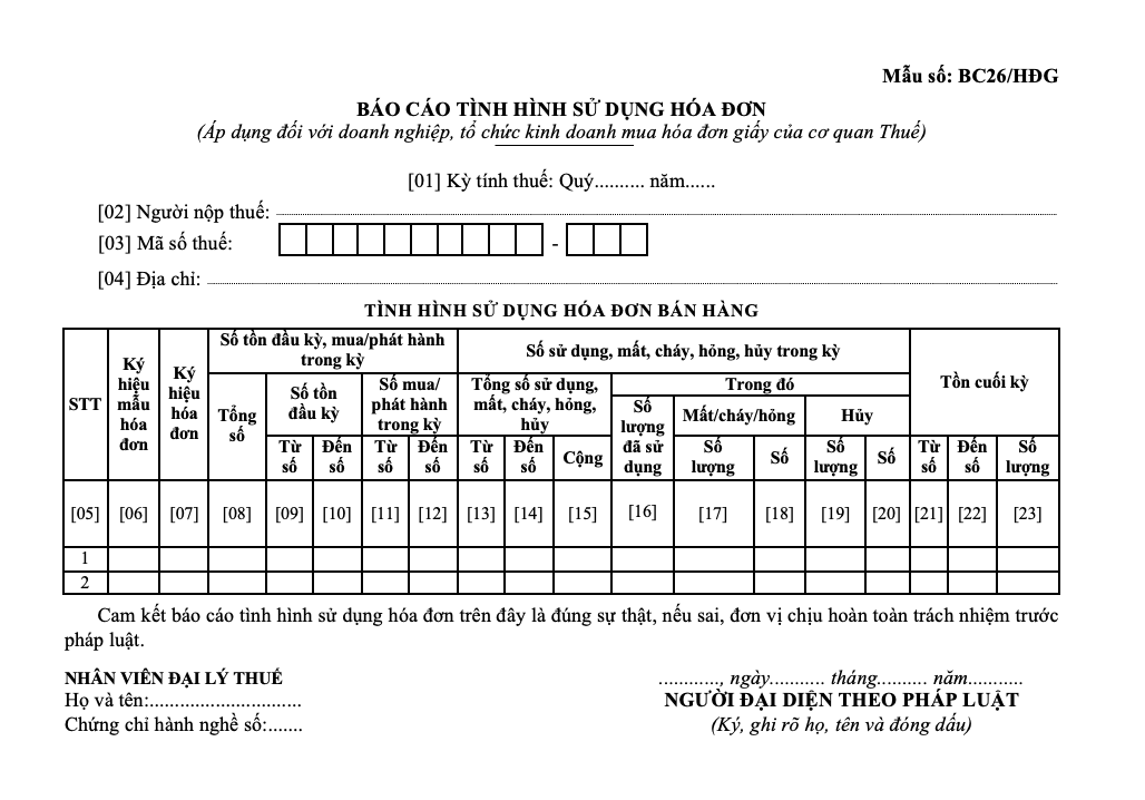 - Báo cáo tình hình sử dụng hóa đơn được nộp theo quý chậm nhất là ngày cuối cùng của tháng đầu của quý tiếp theo quý phát sinh việc sử dụng hóa đơn theo Mẫu số BC26/HĐG Phụ lục IA