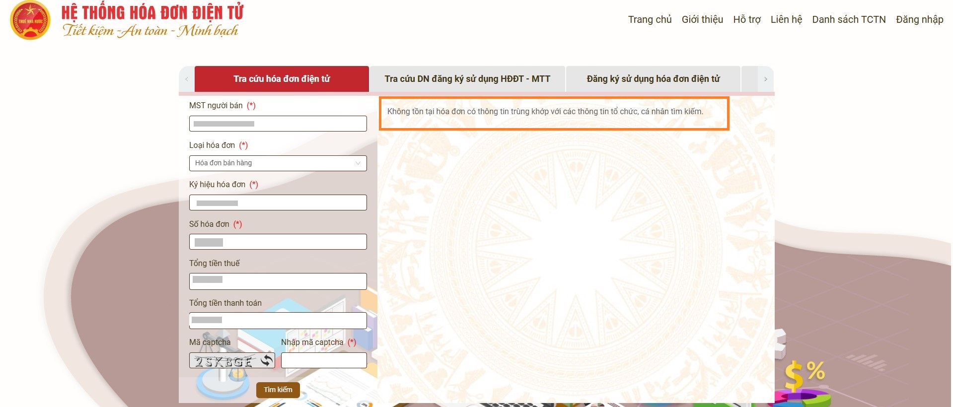 • Nếu thông báo hiển thị “Không tồn tại hóa đơn có thông tin trùng khớp”, bạn cần kiểm tra lại thông tin đã nhập và thực hiện tìm kiếm lại.