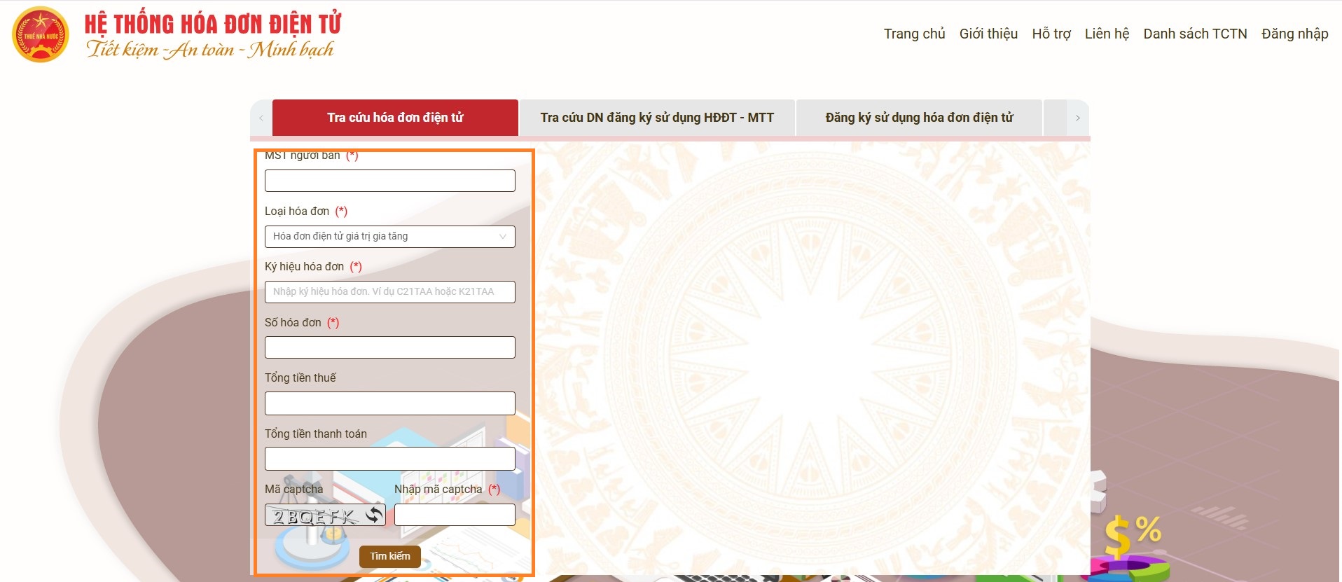Bước 2: Nhập các thông tin cần thiết như mã số thuế, loại hóa đơn, ký hiệu hóa đơn, số hóa đơn, tổng tiền thuế, tổng tiền thanh toán và mã captcha, sau đó click vào mục “Tìm kiếm”.