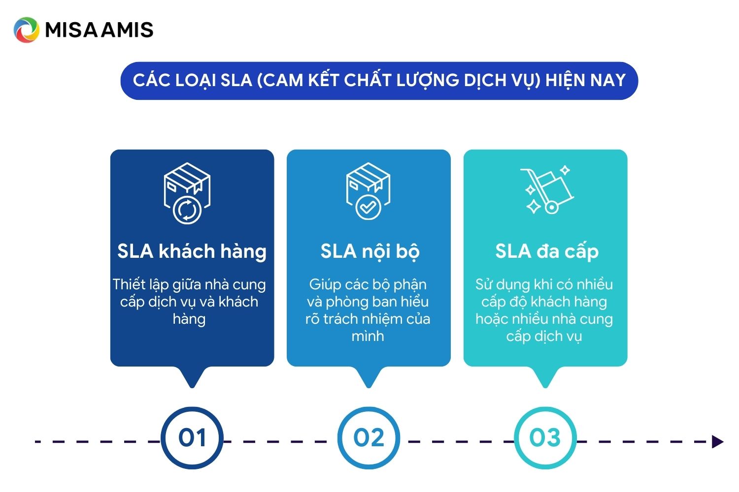 Hiện nay, SLA được chia thành ba loại chính: SLA khách hàng, SLA nội bộ và SLA đa cấp. Dưới đây là mô tả chi tiết về từng loại: