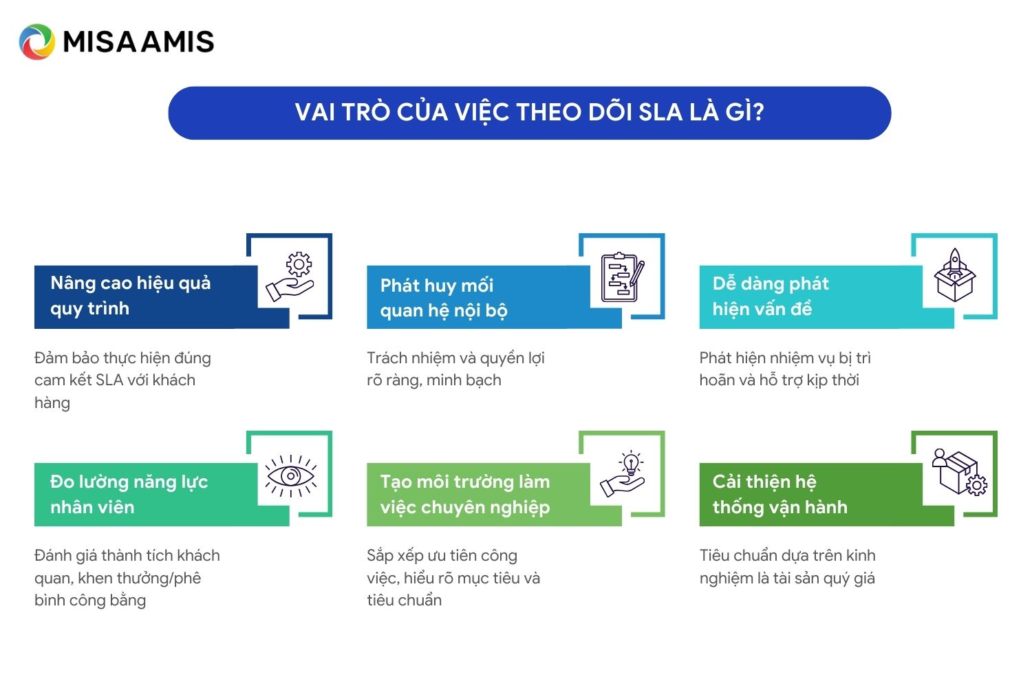 - Tạo môi trường làm việc chuyên nghiệp, minh bạch. Nhân viên biết cách sắp xếp thứ tự ưu tiên công việc tốt hơn, hiểu rõ mục tiêu và tiêu chuẩn thực hiện công việc. Đồng thời, SLA gắn kết với cấp trên thông qua các cuộc họp bàn về quy trình đảm bảo cam kết với khách hàng.