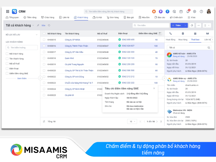 Doanh nghiệp xây dựng bộ tiêu chí chấm điểm tiềm năng để sales tính điểm, tập trung chăm sóc các khách hàng có tỷ lệ chuyển đổi cao. Nếu sử dụng phần mềm AMIS CRM thì hệ thống sẽ tự động cập nhật để dễ dàng quản lý cơ hội, chăm sóc tập trung thay vì dàn trải tất cả các khách hàng.