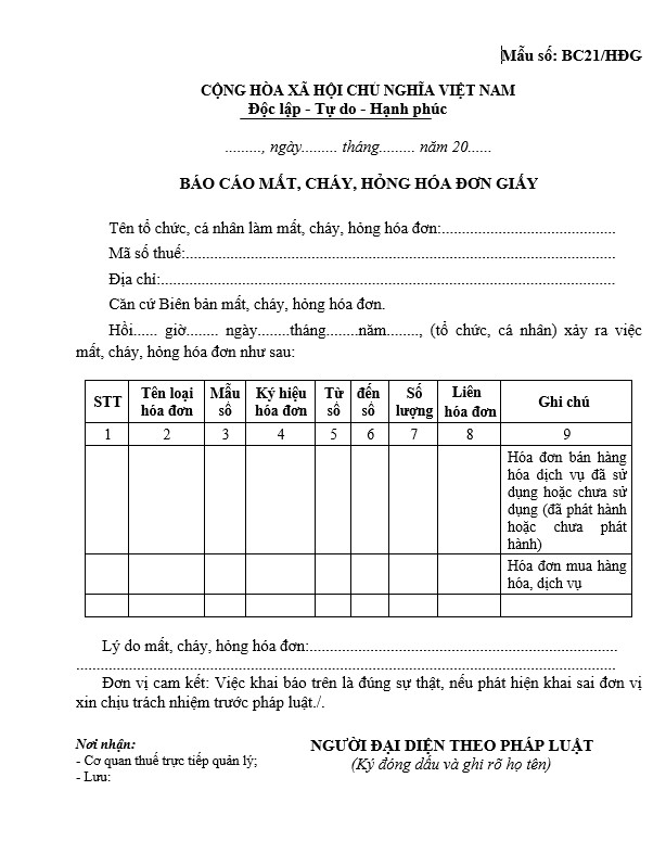 Doanh nghiệp cần lập báo cáo về việc mất, cháy, hỏng hóa đơn đã lập hoặc chưa lập và thông báo với cơ quan thuế quản lý trực tiếp theo mẫu BC21/HĐG Phụ lục IA chậm nhất không quá 05 ngày kể từ ngày xảy ra sự việc. Nếu ngày cuối cùng (ngày thứ 05) trùng với ngày nghỉ thì theo quy định của pháp luật, ngày cuối cùng của thời hạn sẽ được tính là ngày tiếp theo của ngày nghỉ đó.