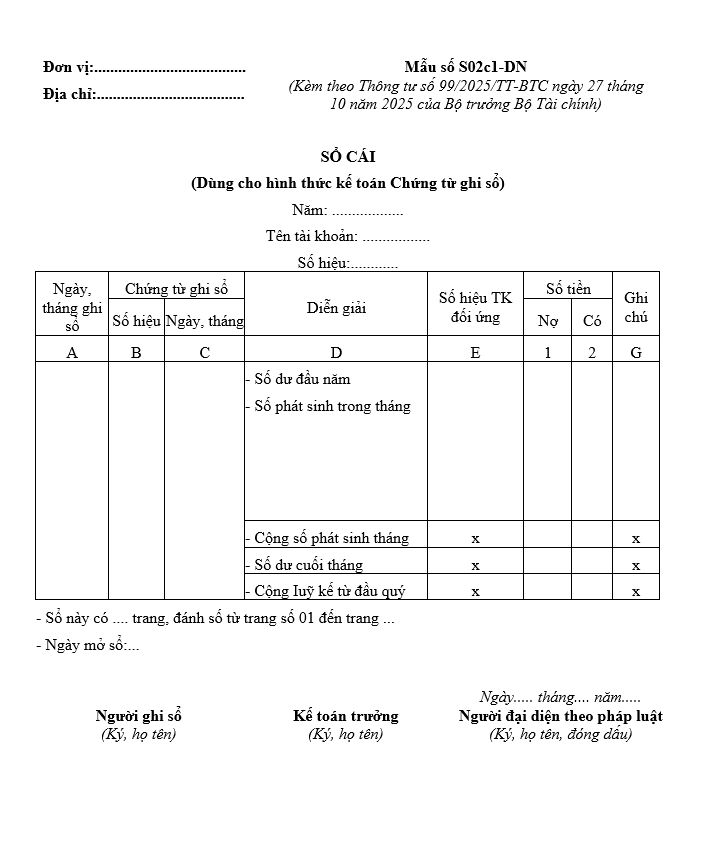 Mẫu sổ cái mẫu số S02c1- DNN như sau: