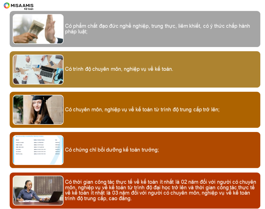 - KTT trình độ trung cấp, cao đẳng: phải có ít nhất 03 năm kinh nghiệm; KTT tốt nghiệp đại học thì cần có ít nhất 02 năm kinh nghiệm.