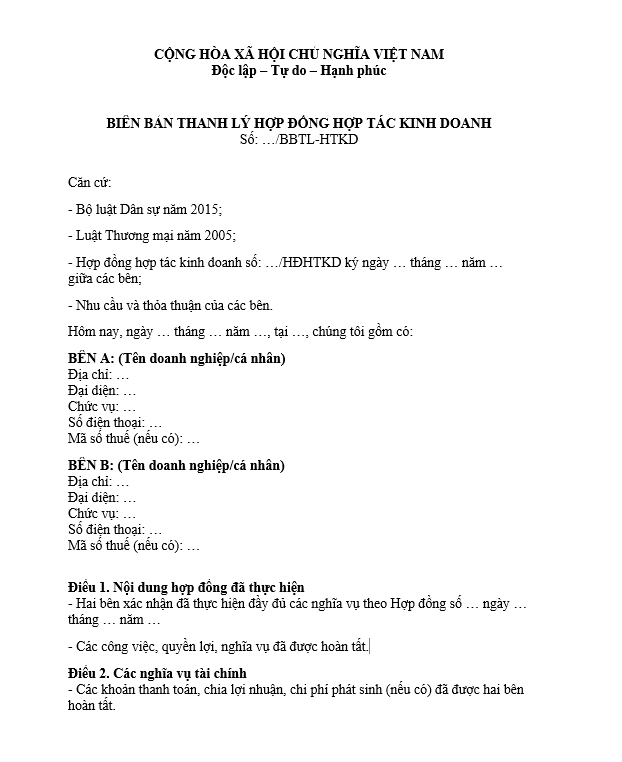 Tải xuống: Mẫu biên bản thanh lý hợp đồng hợp tác kinh doanh