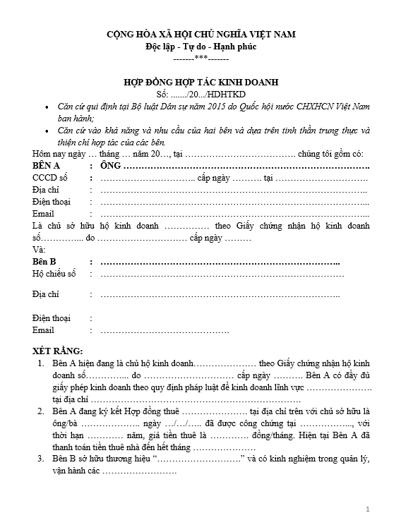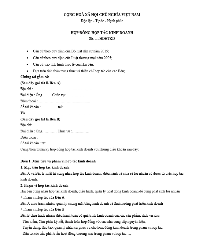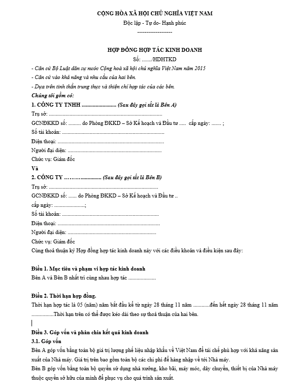 2.1. Mẫu hợp đồng hợp tác kinh doanh số 1