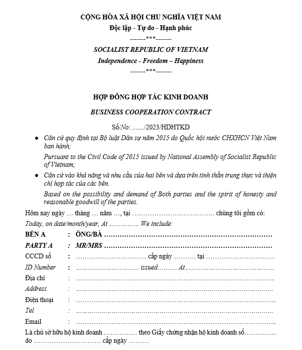 Tải xuống: Mẫu hợp đồng hợp tác kinh doanh song ngữ