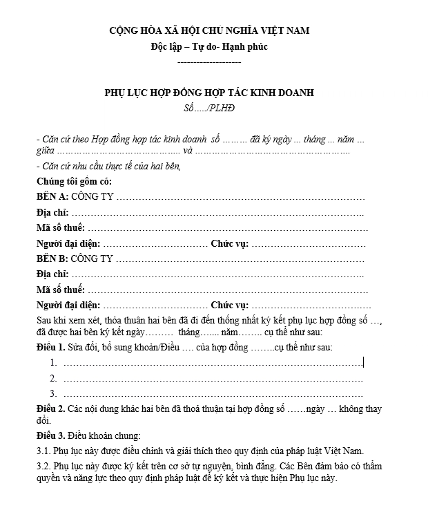 Tải xuống: Phụ lục hợp đồng hợp tác kinh doanh