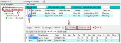 Bước 2: Tiến hành chọn vào phòng ban mà bạn muốn xem công (hoặc cả công ty) -> Tích chọn mã nhân viên -> Chọn khoản thời gian cần xem công “Từ ngày…” “Đến ngày…” -> Chọn xem công hoặc xuất báo biếu. (File sẽ được xuất ra Excel để thực hiện tính công lương)