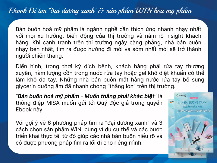Thông qua ebook, MISA giới thiệu với Quý độc giả hai khái niệm về “đại dương xanh” và “sản phẩm WIN” trong bán buôn hoá mỹ phẩm, đều là những cách để tạo nên sự khác biệt, tăng thu giảm chi, thúc đẩy lợi nhuận vượt trội.