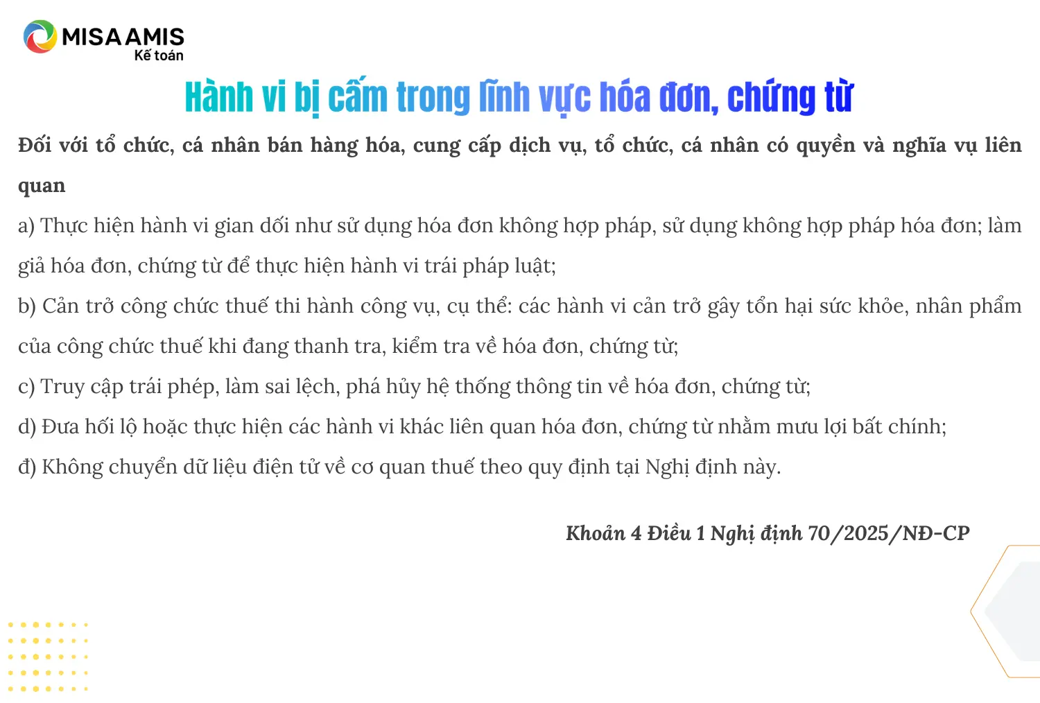 Mới đây, Chính phủ và BTC ban hành Nghị định 70/2025/NĐ-CP và Thông tư 32/TT-BTC sửa đổi bổ sung Nghị định 123/2020/NĐ-CP và thay thế Thông tư 78/2021/TT-BTC hướng dẫn về hoá đơn điện tử. Trong bối cảnh ngành Thuế siết chặt tăng cường quản lý giám sát, ngăn chặn gian lận khi sử dụng hoá đơn điện tử đối với đối tượng hộ kinh doanh, cá nhân kinh doanh cũng như doanh nghiệp, MISA AMIS tổng hợp chia sẻ một số nội dung cần lưu ý để không vi phạm khi sử dụng hoá đơn điện tử.