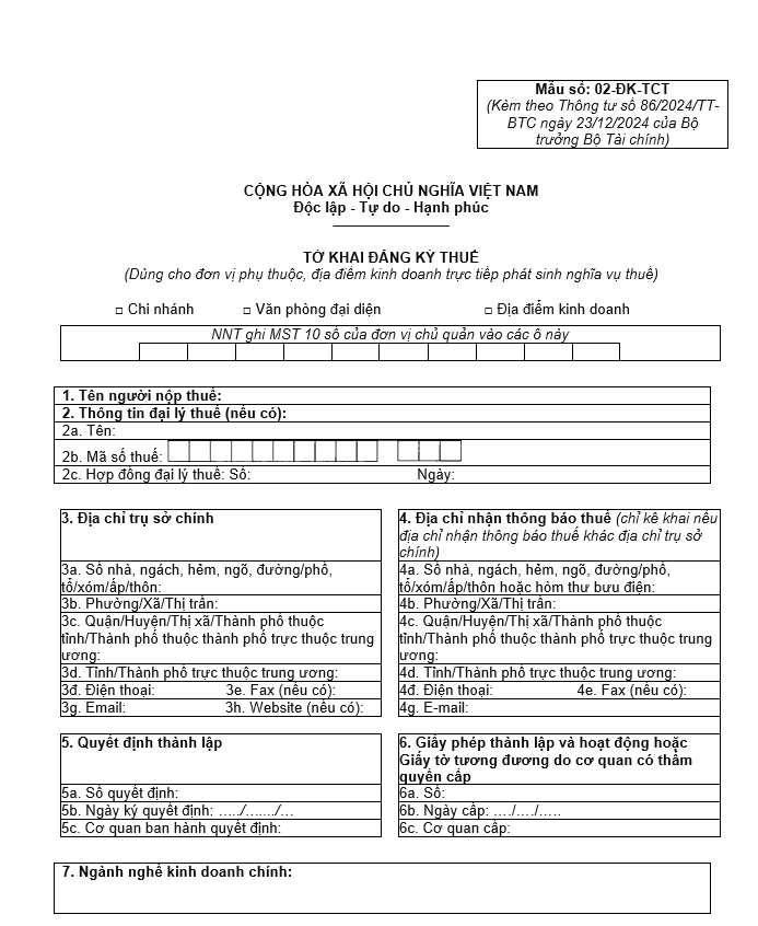Theo mẫu tờ khai đăng ký thuế số 02-ĐK-TCT quy định tại Thông tư số 86/2024/TT-BTC, tại chỉ tiêu số 11, đơn vị chủ quản sẽ tích chọn hình thức hạch toán kế toán về kết quả sản xuất kinh doanh là độc lập hoặc phụ thuộc cho đơn vị phụ thuộc.