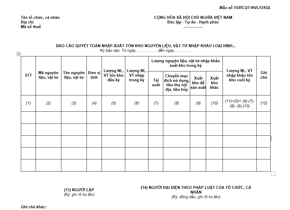 Báo cáo quyết toán hải quan số 15b/BCQT-NLVTNN/GSQL