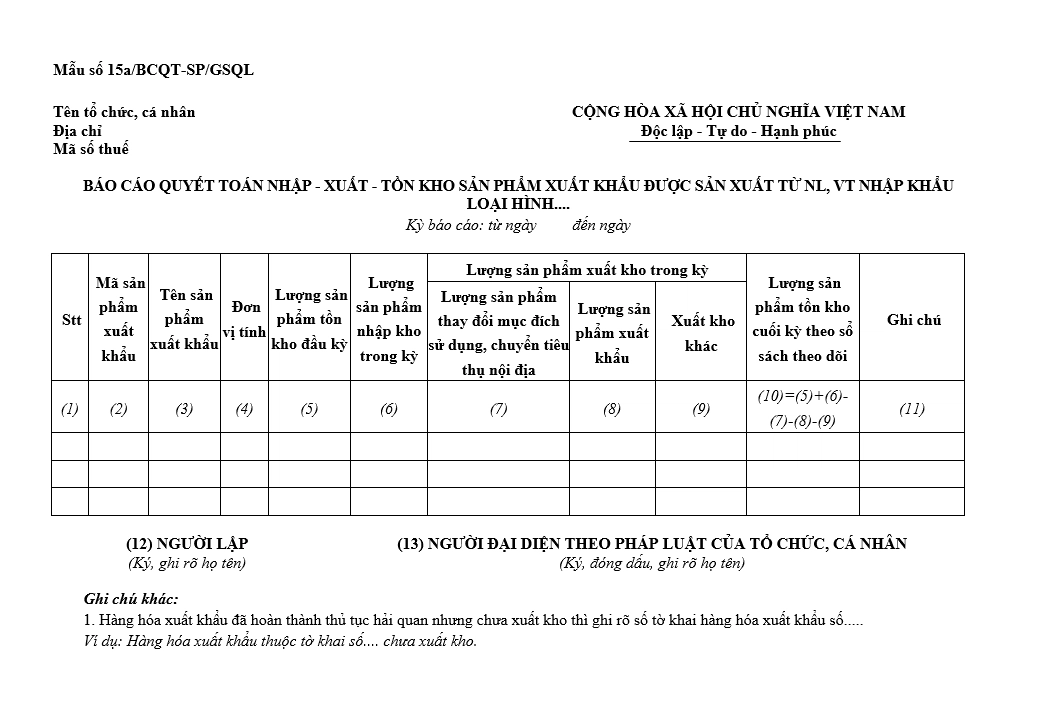 Báo cáo quyết toán hải quan số 15a/BCQT-SP/GSQL