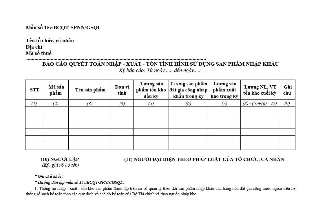 Báo cáo quyết toán hải quan số 15c/BCQT-SPNN/GSQL