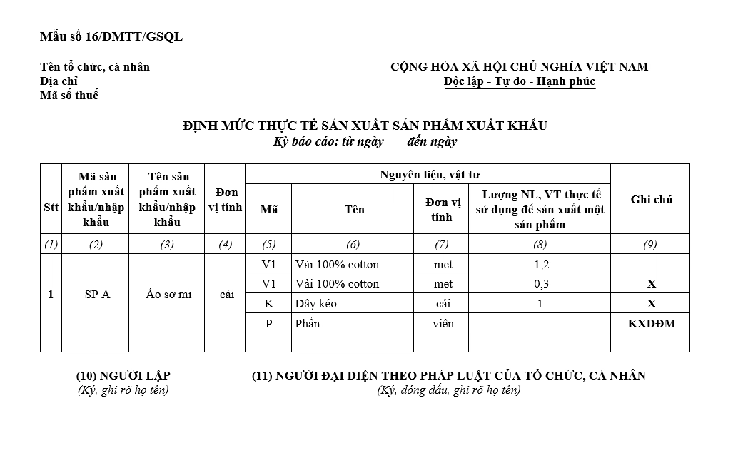 Báo cáo định mức thực tế sản xuất sản phẩm xuất khẩu Mẫu số 16/ĐMTT/GSQL