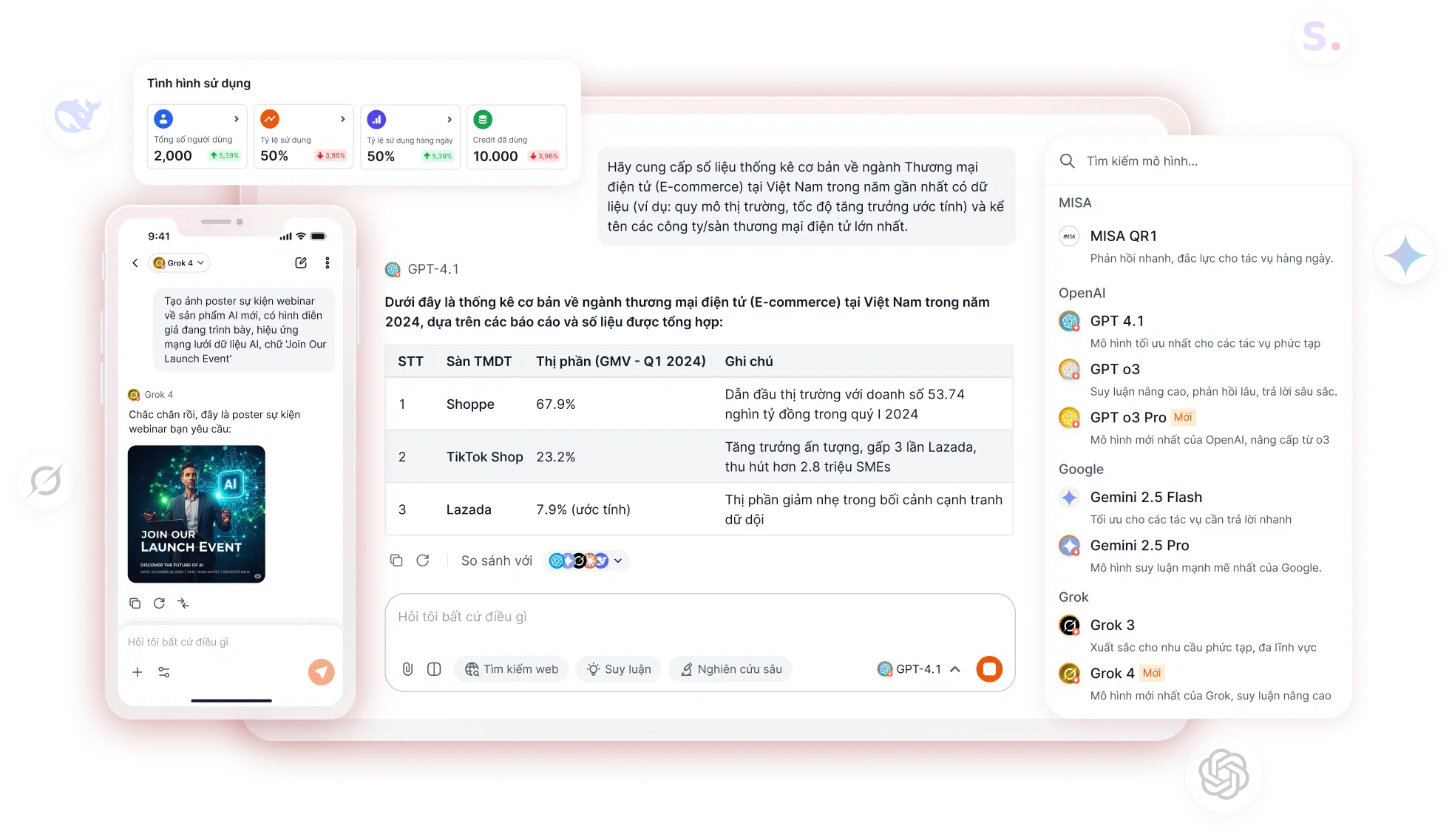 Chỉ 1 tài khoản để truy cập và sử dụng những AI tiên tiến nhất ChatGPT, Gemini, Grok, Claude, MISA AI… Tiết kiệm thời gian, không cần quản lý nhiều tài khoản