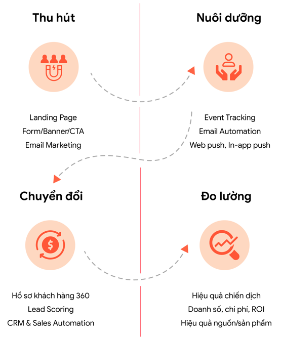 Quy trình marketing tự động - cá nhân hóa theo hành trình từng khách hàng. Liên tục bám đuổi mục tiêu, tối ưu tỷ lệ chuyển đổi, gia tăng khách hàng trung thành. Đo lường minh bạch, chi tiết tới từng chiến dịch.